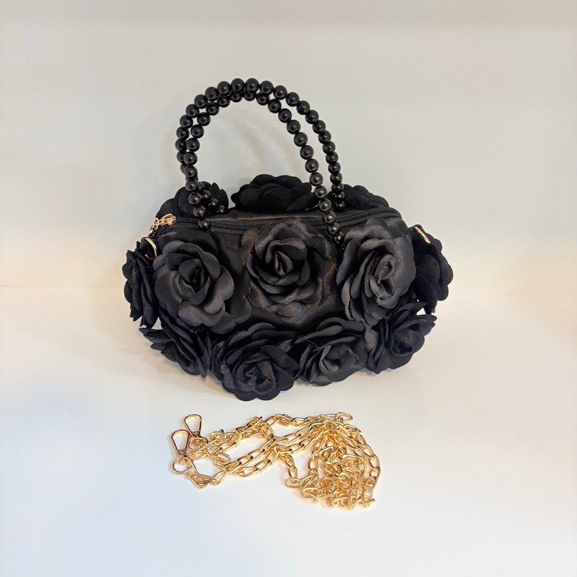 Siyah kadın çanta, koyu renkli gül desenleri ve zincir detayıyla dikkat çeker. Sentetik kumaştan üretilmiş, gotik ve avangart tarzı bir tasarıma sahiptir. Düğünler için uygundur, modayı takip edenler için Paris tarzı sunar.