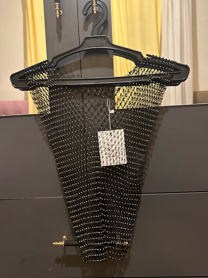 Zincir detaylı, halter yaka ve yılan desenli siyah büstiyer. Plastik malzemeden, askılı kollu ve midi boyda. Sokak modasına uygun, avant-garde tarzda.