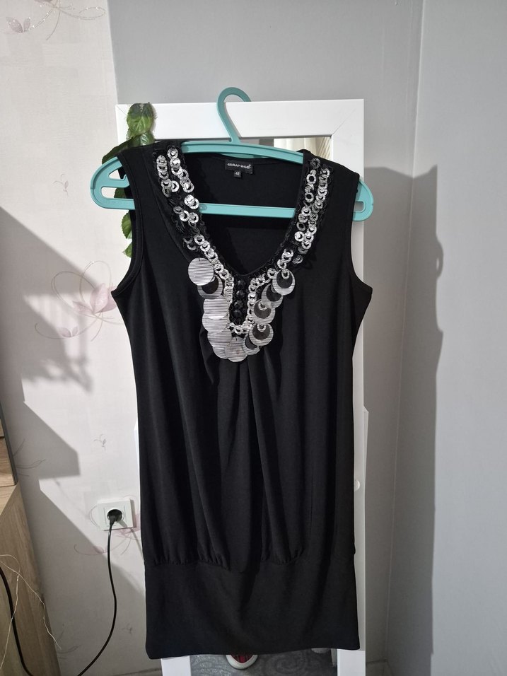 V yaka, zincir detaylı siyah hamile tunik. Kolsuz, normal midi boyda, bol kesim ve sentetik kumaştan, baskılı desenli.