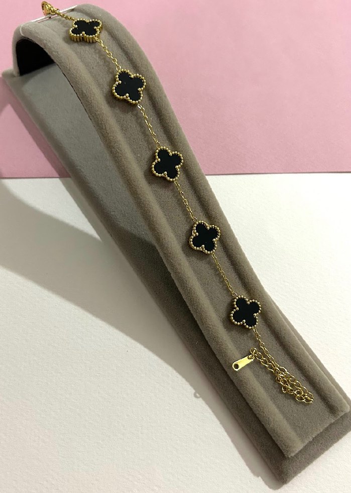 Altın renkli zincir detaylı bileklik, siyah işlemeli çiçek desenleriyle klasik ve minimalist tarzı bir araya getirir, günlük kullanım için uygundur.