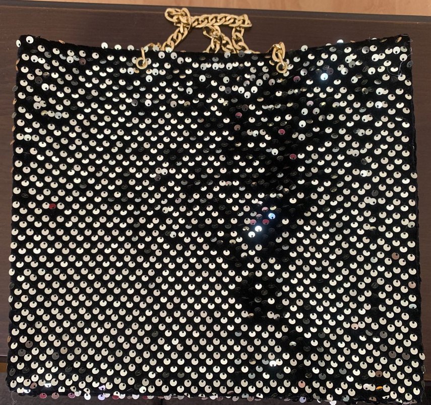 Siyah payet pul işlemeli kadın çanta, altın zincir askılı, parti ve gotik tarz için uygun.