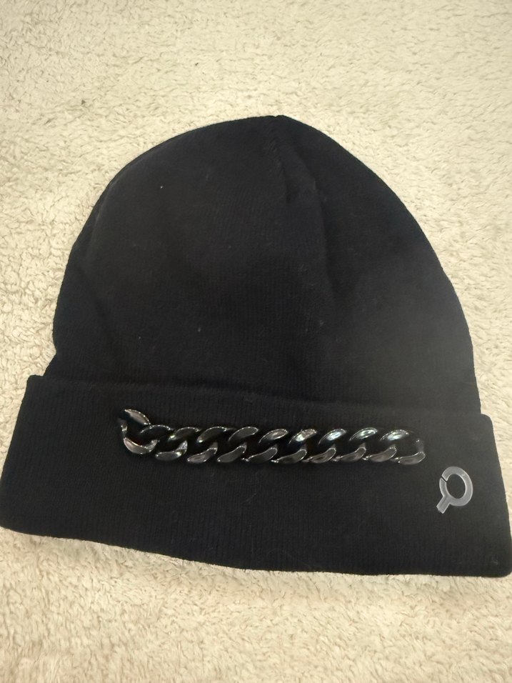 Yumuşak ve sıcak kumaştan yapılmış, parlak zincir detaylı siyah kadın bere, trend ve rahat tarz için uygundur.
