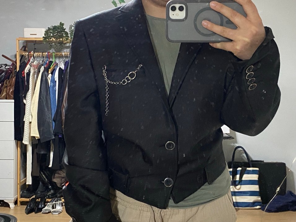 Fıtlı siyah blazer, zincir detaylı ve çentikli yaka ile ofis için modern ve parlak bir tarz sunar. ✨