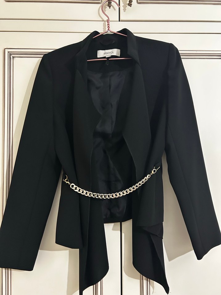 Saten dokulu, zincir detaylı siyah blazer. Klasik şıklık için normal boyda, kesimli ve yakası kesik. Ofis için uygun, uzun kollu.