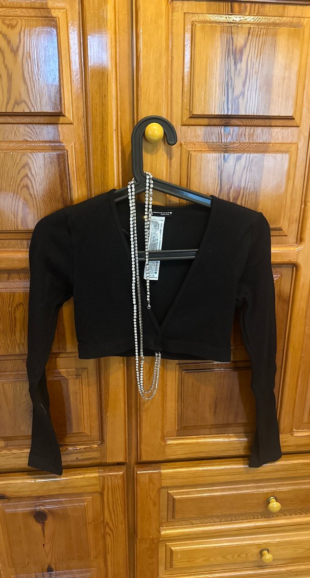 Uzun kollu, zincir detaylı, halter yakalı siyah kadın bluz. İpeksi kumaştan, gotik stil için uygun.