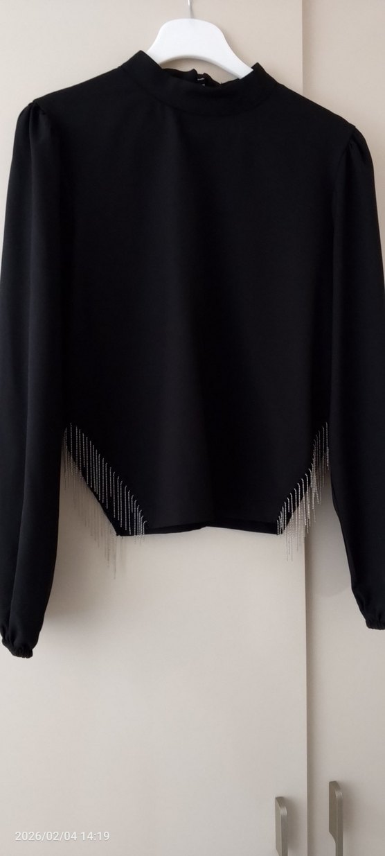 Zincir detaylı, uzun kollu siyah bluz. Bisiklet yaka ve bol kesim, nakışlı detaylarla ofis için uygun.etek bluz takım