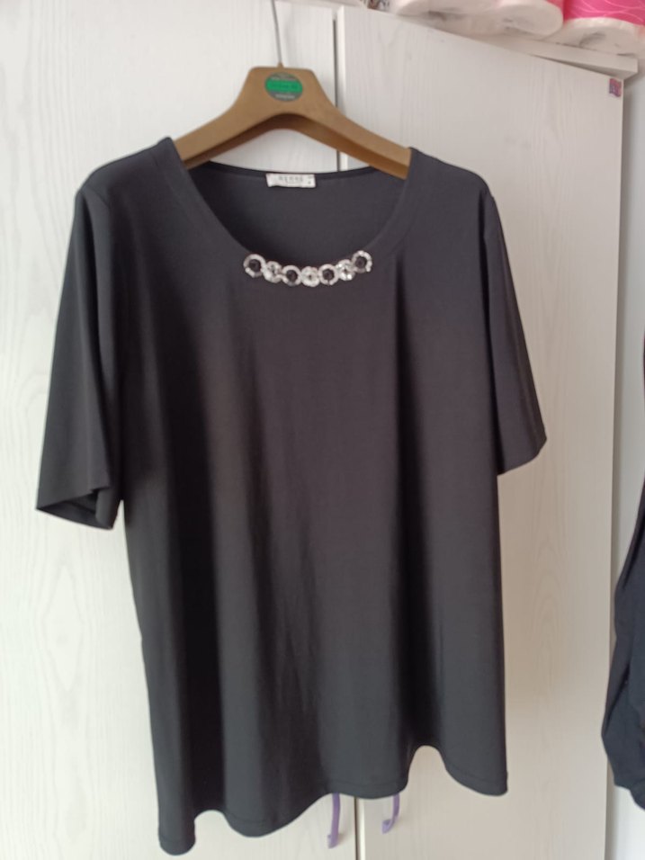 Kısa kollu, yuvarlak yakalı, zincir detaylı, siyah, bol kesim, ipeksi dokulu bluz. Gri baskılı deseniyle günlük kullanıma uygundur.