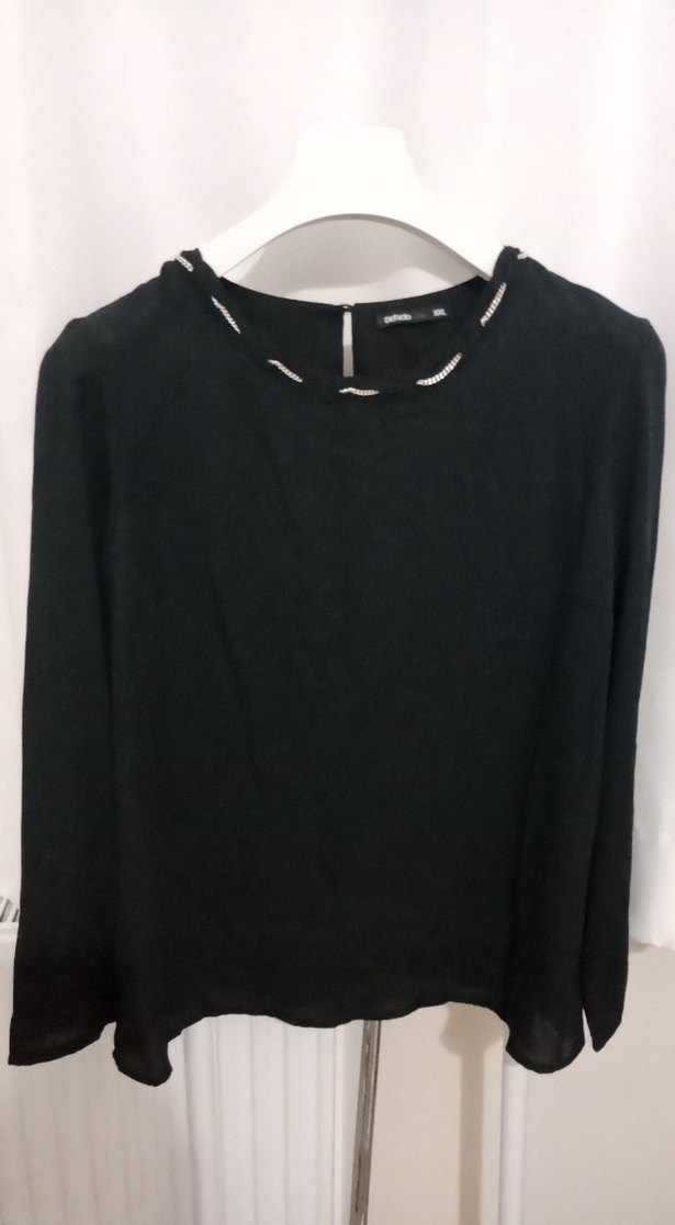Zincir detaylı, yuvarlak yakalı, uzun kollu siyah kadın bluz. Rahat kesimli ve ipeksi dokuda, minimalist goth tarzında günlük kullanıma uygun.