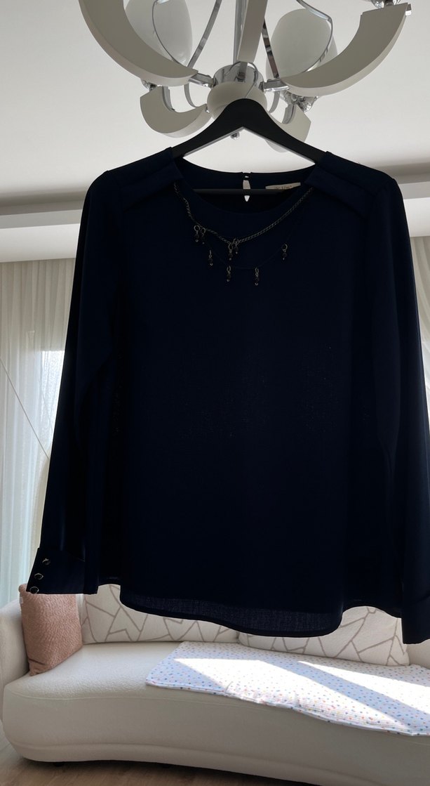 Siyah, zincir detaylı, yuvarlak yakalı, uzun kollu, midi uzunlukta, bol kesim, ipeksi dokulu kadın bluz. Goth tarzıyla ofis kullanımına uygun.