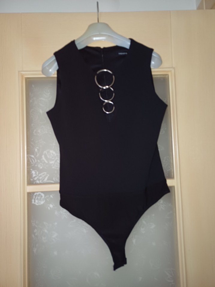 Siyah renkte, zincir detaylı ve ön kısmında üç metal halka bulunan, cesur sokak stili için tasarlanmış kadın body. Kolsuz ve vücuda oturan kesime sahiptir.