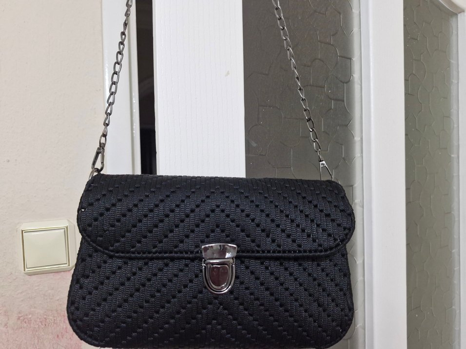 Zincir detaylı, dokulu sentetik kumaştan siyah kadın çantası. Modern klasik stil ve güvenli kapanış sunar, günlük kullanıma uygundur. sipariş alınır