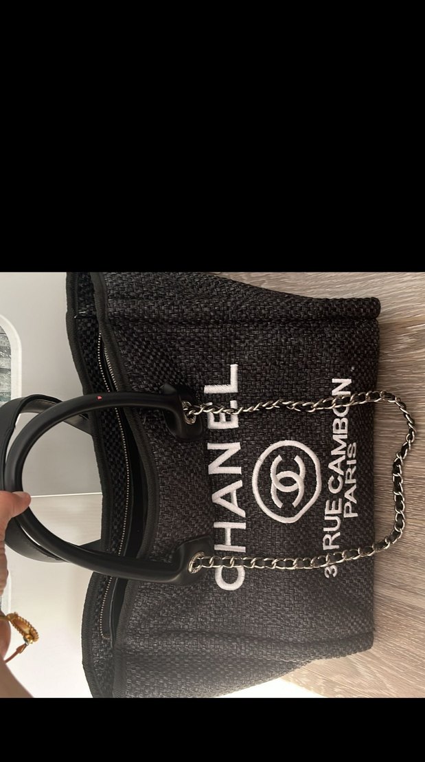Siyah renkli, baskılı Chanel logosu ve zincir detaylı kadın çantası, sentetik kumaş ve sokak stilini günlük kullanıma sunar.
