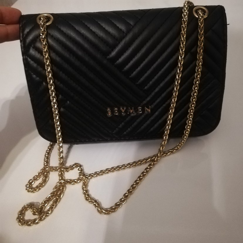 Zincir detaylı, siyah kapitone desenli kadın çantası. Gold renk zincirleri ve BEYMEN logosu bulunur. Cesur ve koyu Paris tarzı aksesuardır.