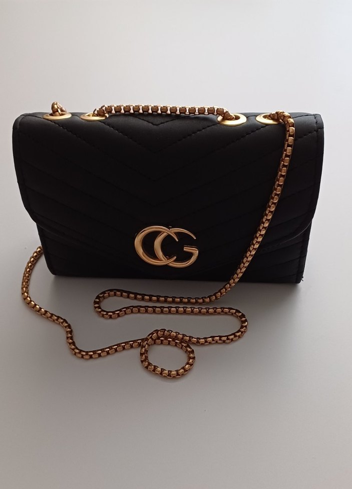 Desenli siyah kadın çanta, zincir detaylı. Modern klasik tarzı ve ışıltılı dokunuşuyla günlük kullanıma uygun. Hiç kullanılmadı 13×19,5 cm ölçüleri