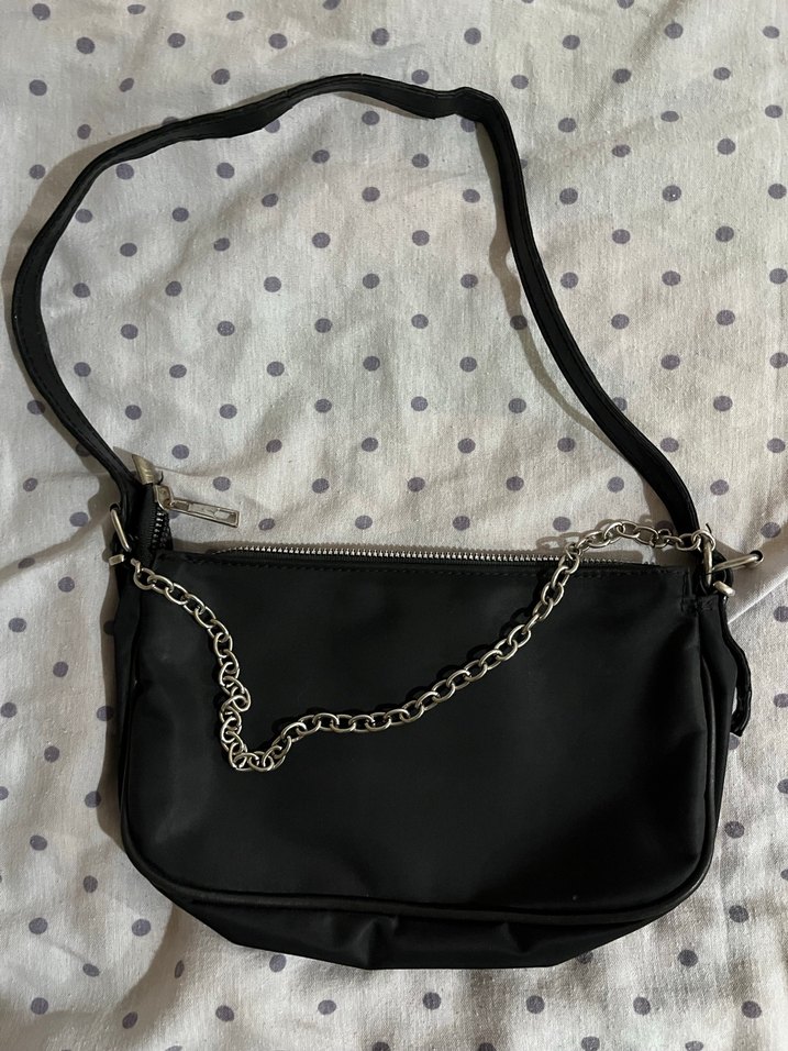 Parlak siyah renkte, zincir detaylı ve düz yüzeyli kadın çantası. Günlük kullanıma uygun, trend casual tarzda. omuz çantası