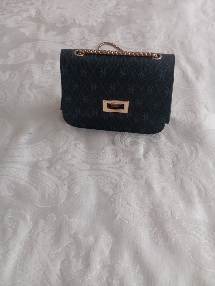 Siyah renkli, baskılı desenli ve zincir detaylı sentetik kumaş kadın çantası. Klasik zarafet ve sokak stiline uygun, günlük kullanıma uygundur.