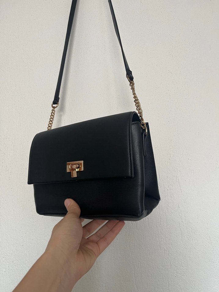 Siyah kadın çanta, zincir detaylı ve Paris esintili modern klasik stilde. Günlük kullanıma uygun şık bir parça. Çapraz çanta