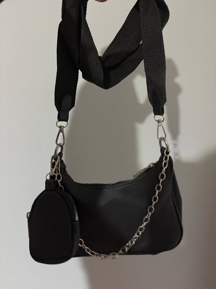 Siyah kadın çantası, zincir detaylı ve sentetik kumaştan üretilmiştir. Günlük kullanıma uygun, trend sokak modasına uyum sağlar.