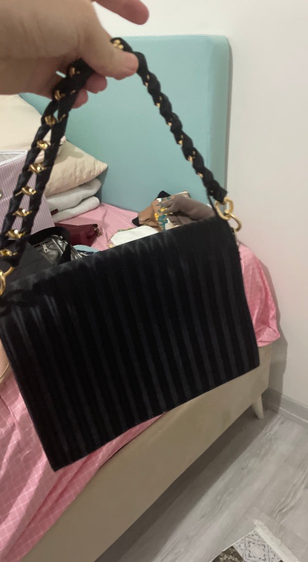 Zincir detaylı sapı ve sentetik kumaştan yapılmış siyah kadın el çantasıdır. Klasik, gotik tarzda, desen içermeyen yüzeye sahip, günlük kullanıma uygundur.