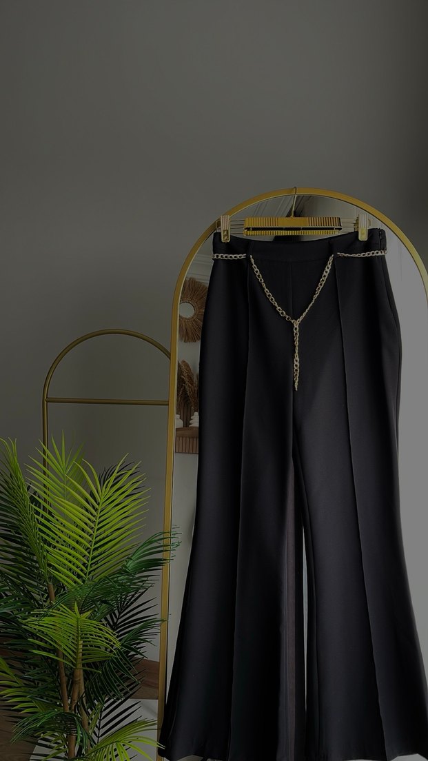Uzun siyah İspanyol pantolon, ipeksi dokusu ve belde zincir detayıyla dikkat çeker. Ofis için uygun, klasik ve zarif tarzda, regular fit.