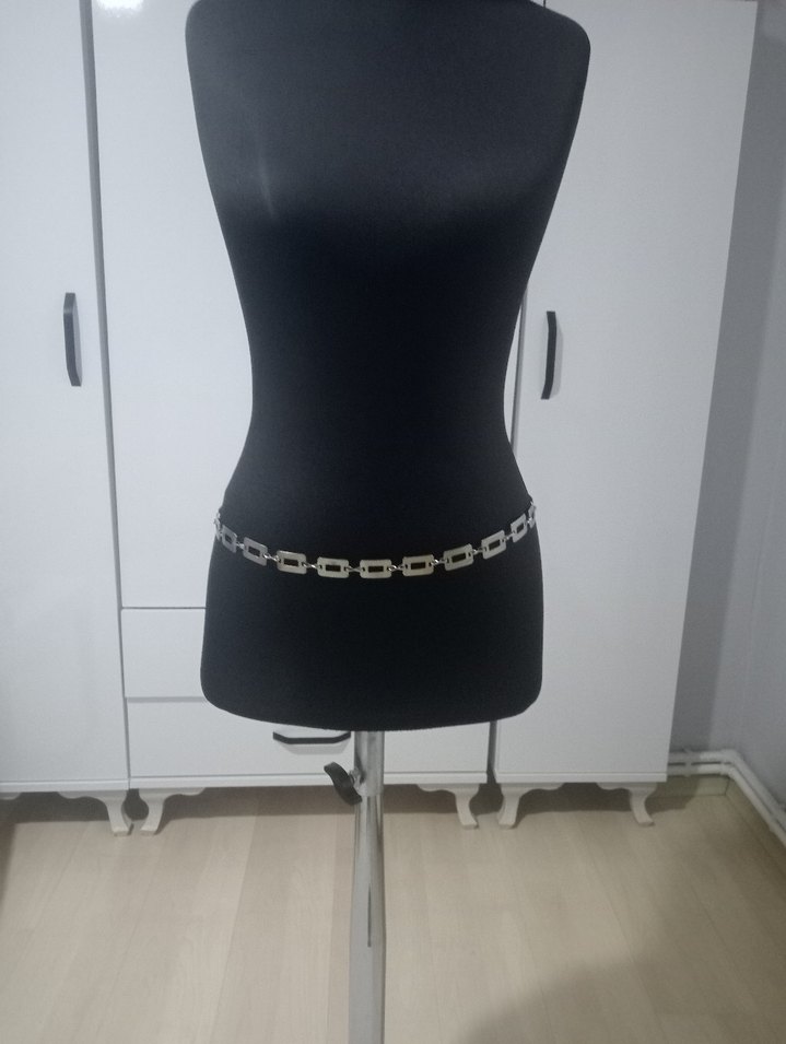 Sentetik kumaştan yapılmış, zincir detaylı siyah kadın kemeri, çağdaş ve avangart bir tarz sunar. Trend belirleyiciler için şık bir aksesuar.