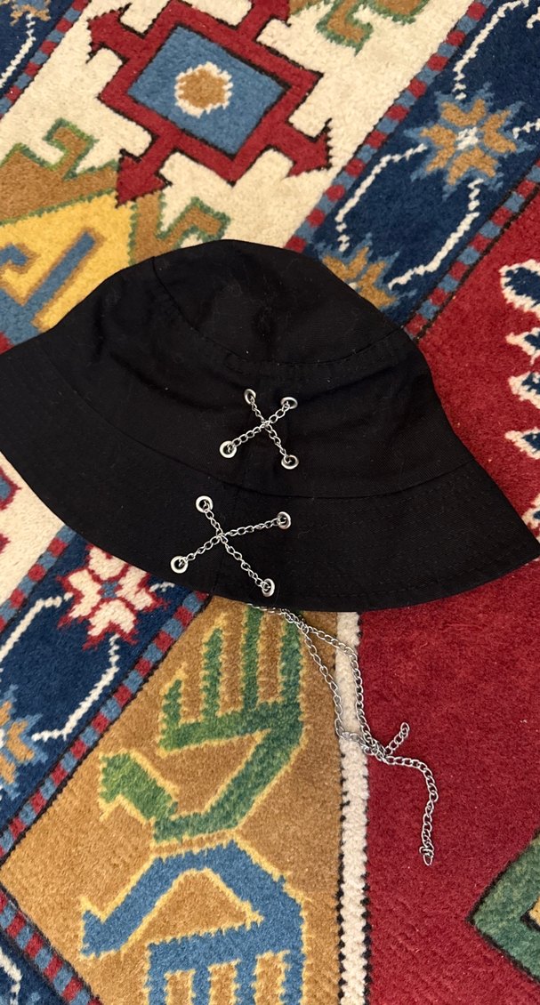 Zincir detaylı siyah tekstil kadın şapka, bohem ve grunge punk tarzına uygun. Koyu renk ve zincirler retro, karşı kültür havası katıyor.