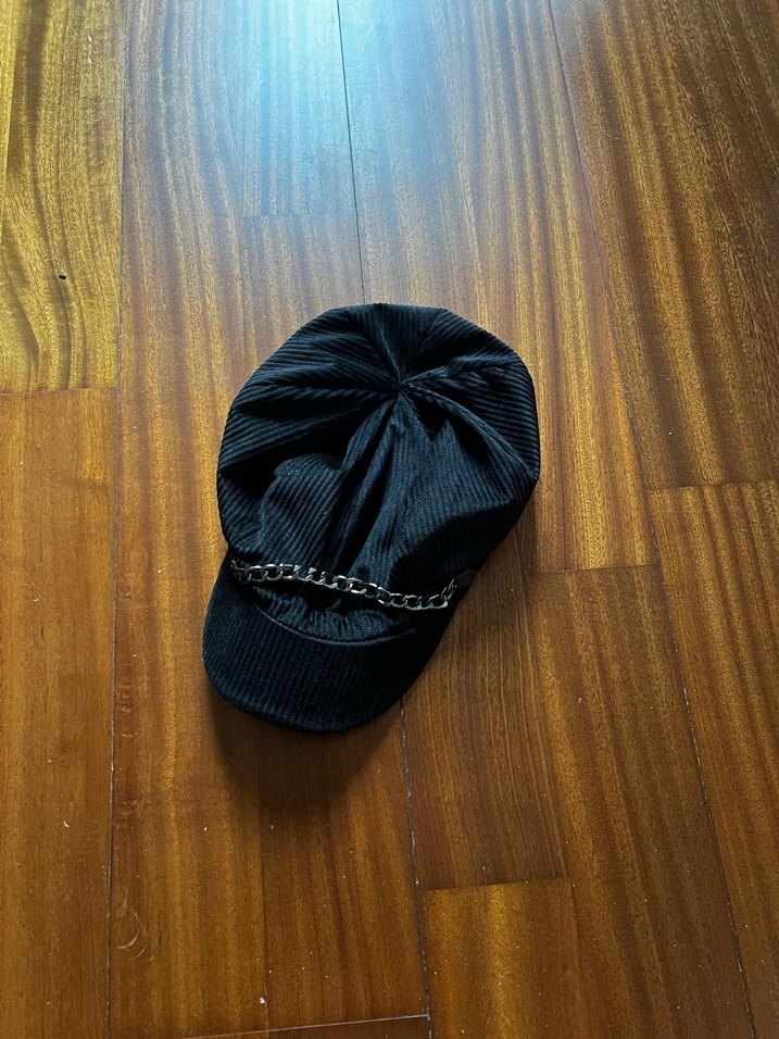 Sentetik kumaştan yapılmış, zincir detaylı siyah kadın şapkası. Koyu tonlarda, Paris tarzı ve trend sokak modasına uygun.