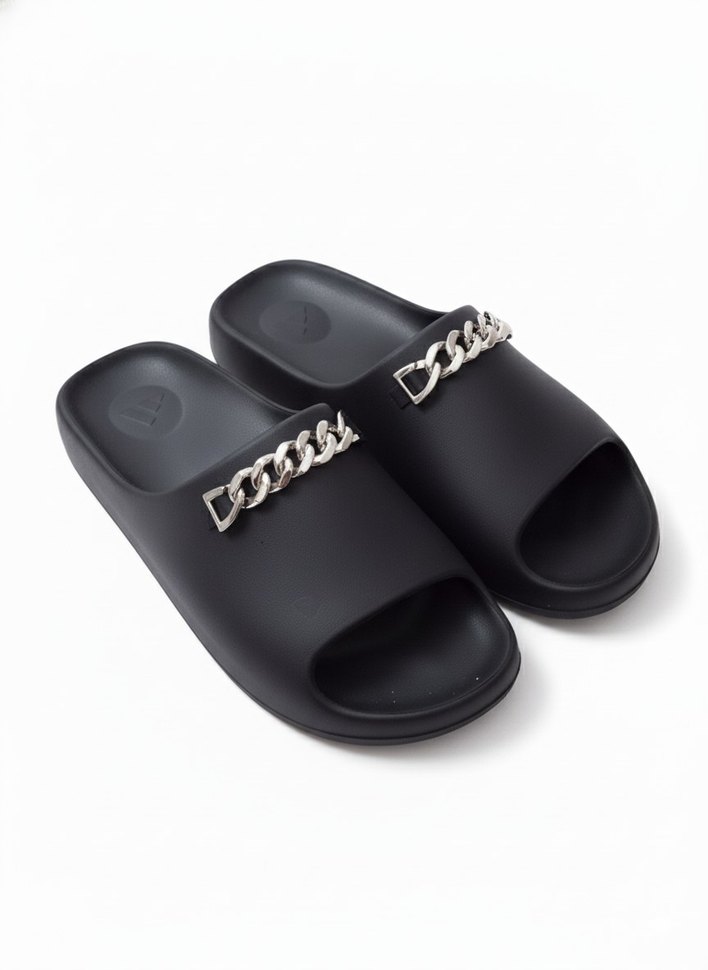 Dayanıklı kauçuk malzemeden platform topuklu siyah kadın terlik, parlak zincir detayı ile günlük kullanım için uygundur.