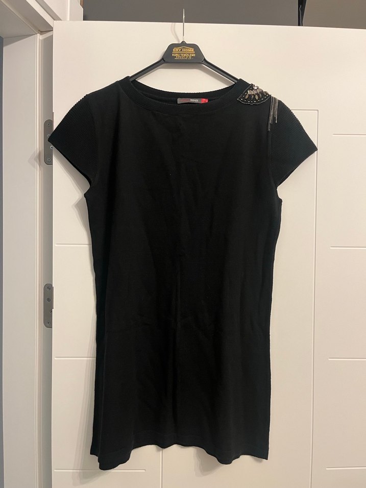 Siyah midi uzunlukta, kısa kollu ve bisiklet yaka kadın tişörtü. Zincir detaylı omuz süsüyle minimalist streetwear tarzı sunar. Sentetik kumaştan üretilmiştir.