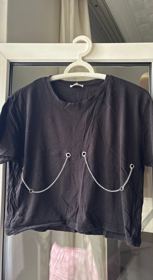 Gündelik kullanıma uygun, zincir detaylı, goth tarzı siyah kadın tişörtü. Ön kısmında gümüş renk zincirlerle süslenmiştir.