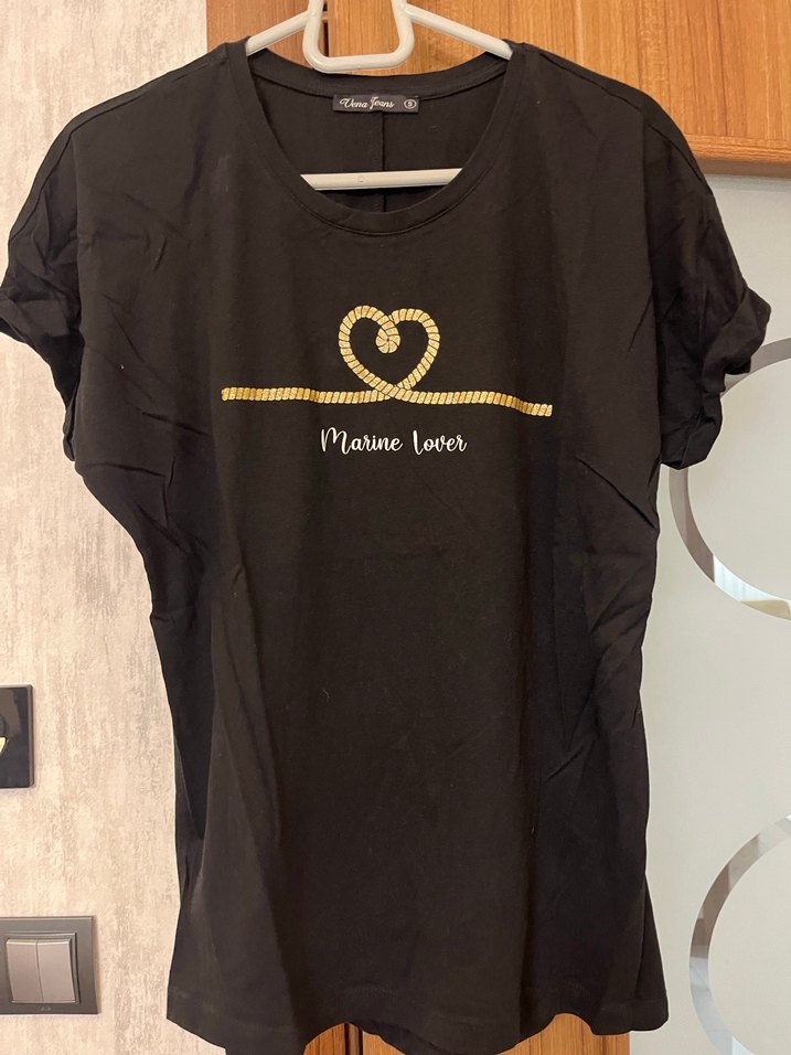 Siyah pamuklu, kısa kollu, bol kesim tişört. Zincir detaylı kalp ve "Marine lover" baskılı, yuvarlak yaka, rahat sokak stili için uygun.
