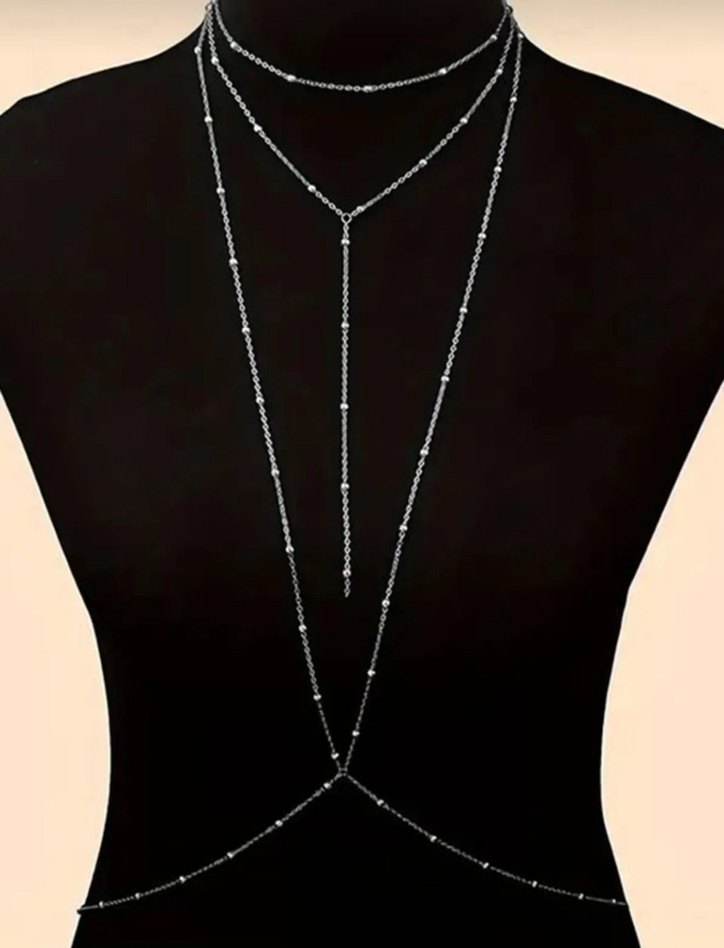 Zincir detaylı siyah kadın vücut zinciri, cesur ve göz alıcı gotik tarzda. Günlük kullanım için desen içermeyen tasarım.