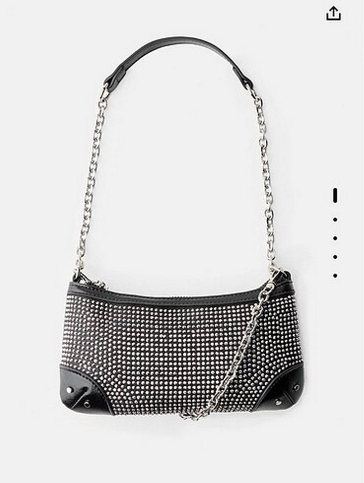 Sentetik kumaştan yapılmış, parlak kareli desene ve zincir detaylara sahip siyah kadın çantası, gündelik kullanıma uygun, trend gotik tarzda.