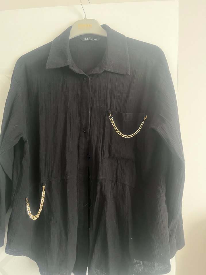 Zincir detaylı cepleri olan, keten kumaştan siyah, parlak görünümlü, yakalı ve uzun kollu bol kesim midi gömlek. Günlük kullanıma uygundur.