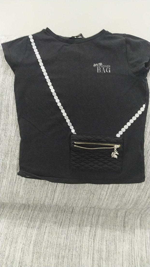 Siyah, kısa kollu, bisiklet yaka kız tişörtü. Zincir baskılı, küçük kapitone detaylı cep bulunur. Deri kumaştan, rahat kesimle sokak stili için uygundur.