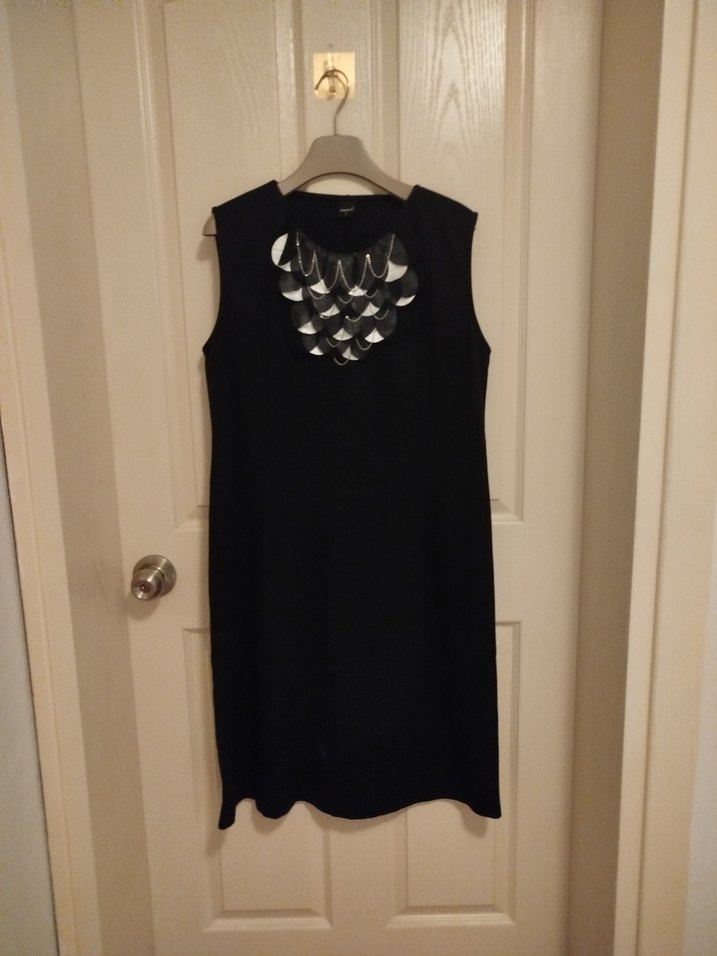 Bu siyah kolsuz midi elbise, zincir detaylı ve V yakalı, gotik ve şık bir tarz için uygundur.