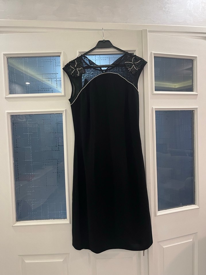 Siyah, zincir detaylı, straplez ve kolsuz, gotik tarzda, vücuda oturan midi elbise, ofis için uygundur.