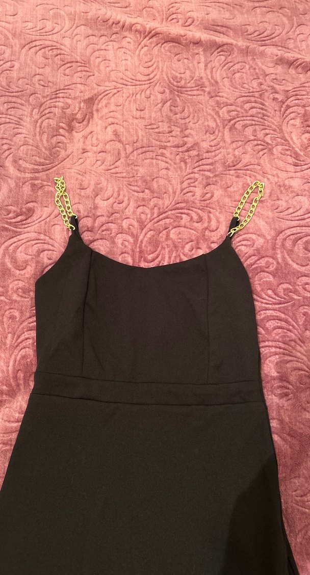 Siyah, zincir detaylı askılı, straplez, midi uzunlukta, vücuda oturan gotik stil elbise, romantik akşamlar için uygundur.