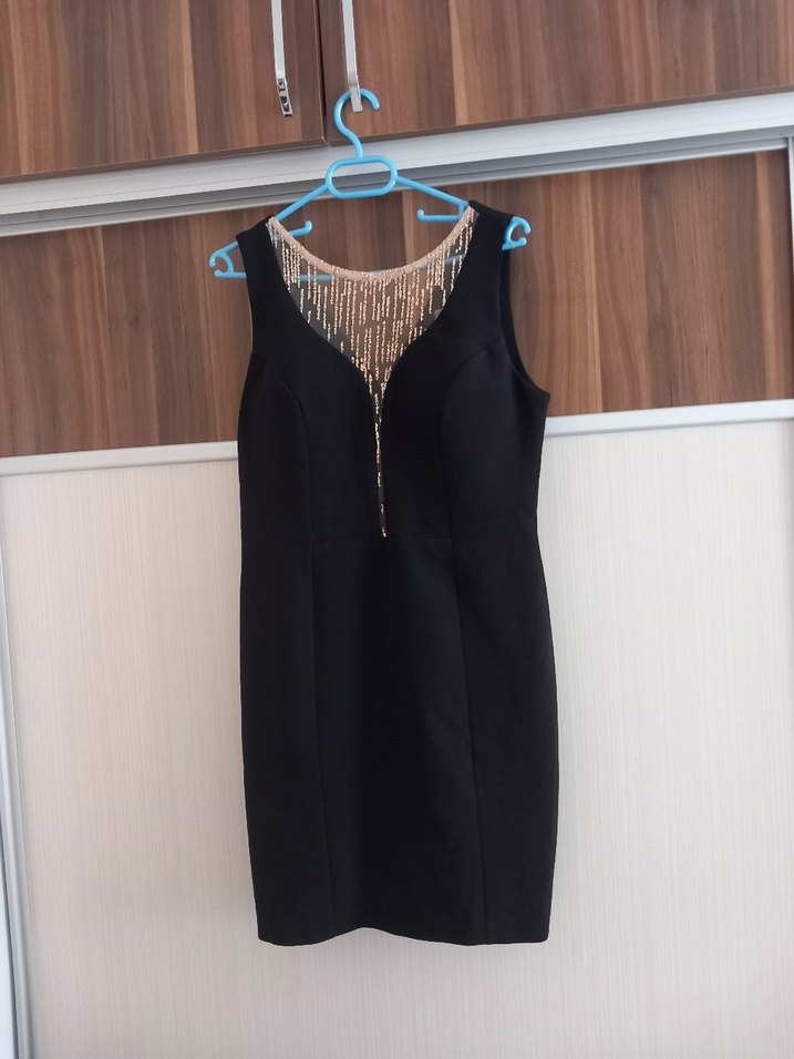 V yaka, kolsuz, zincir detaylı siyah midi elbise. Minimalist ve gotik tarzda, parti için uygun. m bedene de uyar