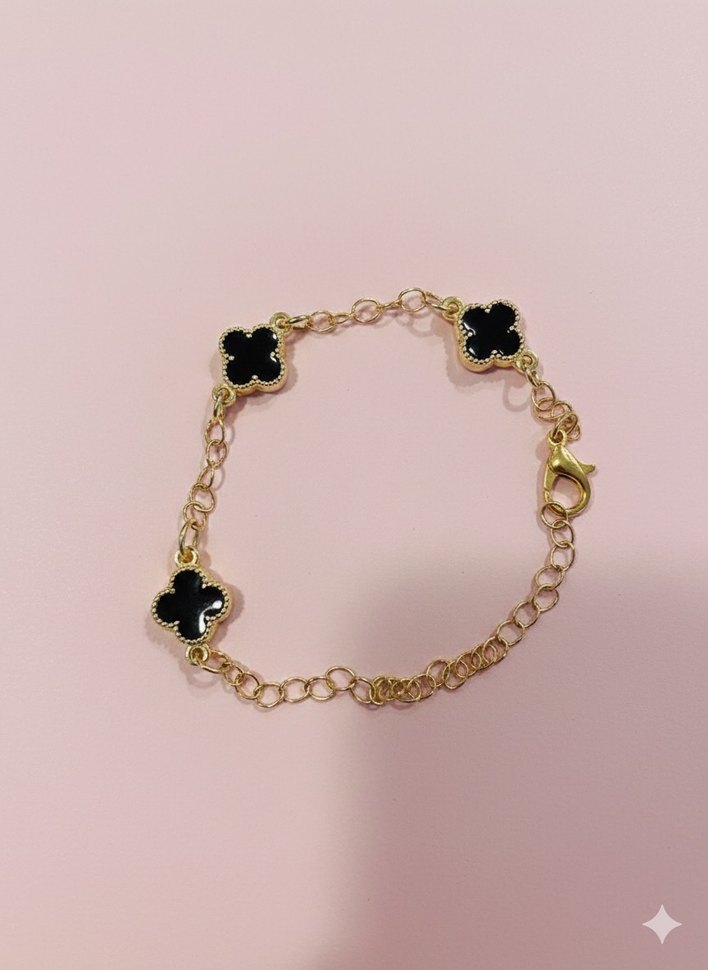 Altın renginde zincir detaylı, dört siyah mineli yonca şeklinde süslemeye sahip minimal ve gotik tarzda bileklik.