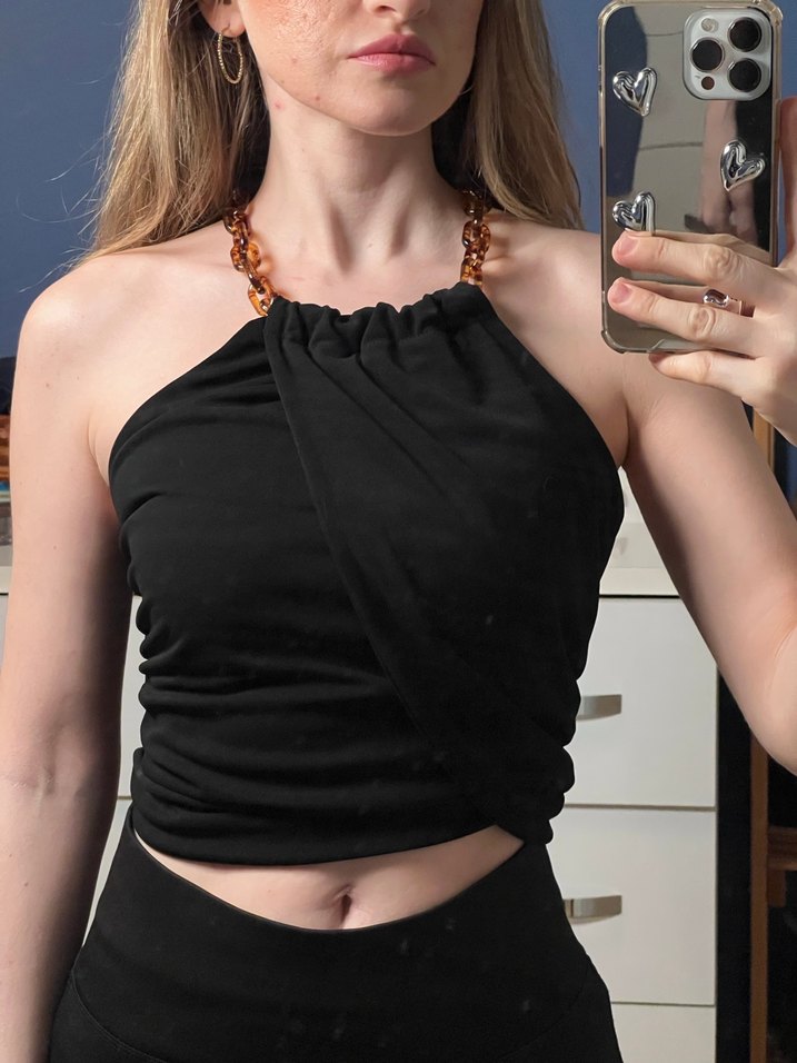 Zincir detaylı siyah mini crop top. Askısız, kısa ve dar kesim, günlük sokak stili için uygundur.
