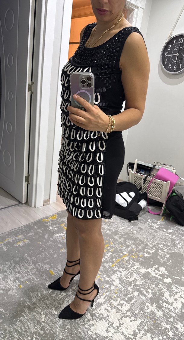Dar kesim, siyah mini elbise, askılı kol ve yuvarlak yaka detaylarına sahip. Zincir süslemeleri ve hafif yılan deseniyle günlük kullanıma uygun, çağdaş ve gösterişli tarzda.