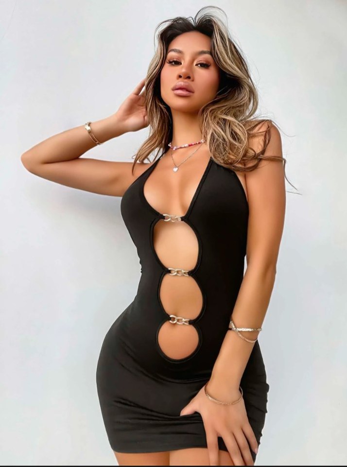 Siyah, askılı mini elbise, ön kısmında zincir detaylı kesiklerle dikkat çeker. İpeksi kumaştan yapılmıştır. Romantik gece için uygundur. Beden;S-M/L-XL