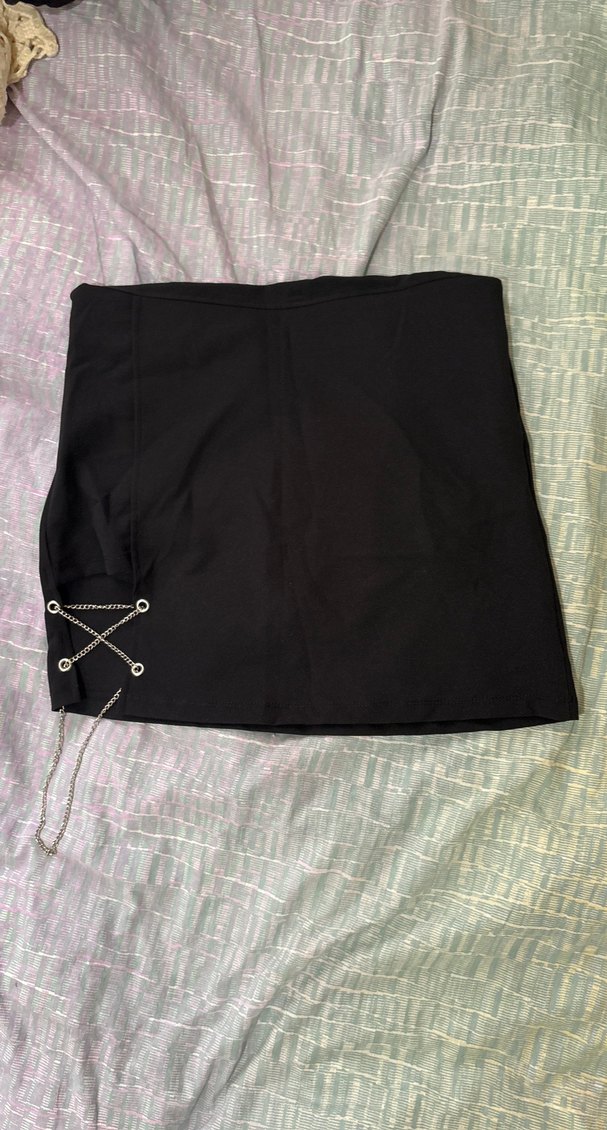 Siyah mini etek, zincir detaylarıyla dikkat çeker. Sentetik kumaştan olup, dar kesim ve gothic tarzda şık bir görünüme sahiptir.
