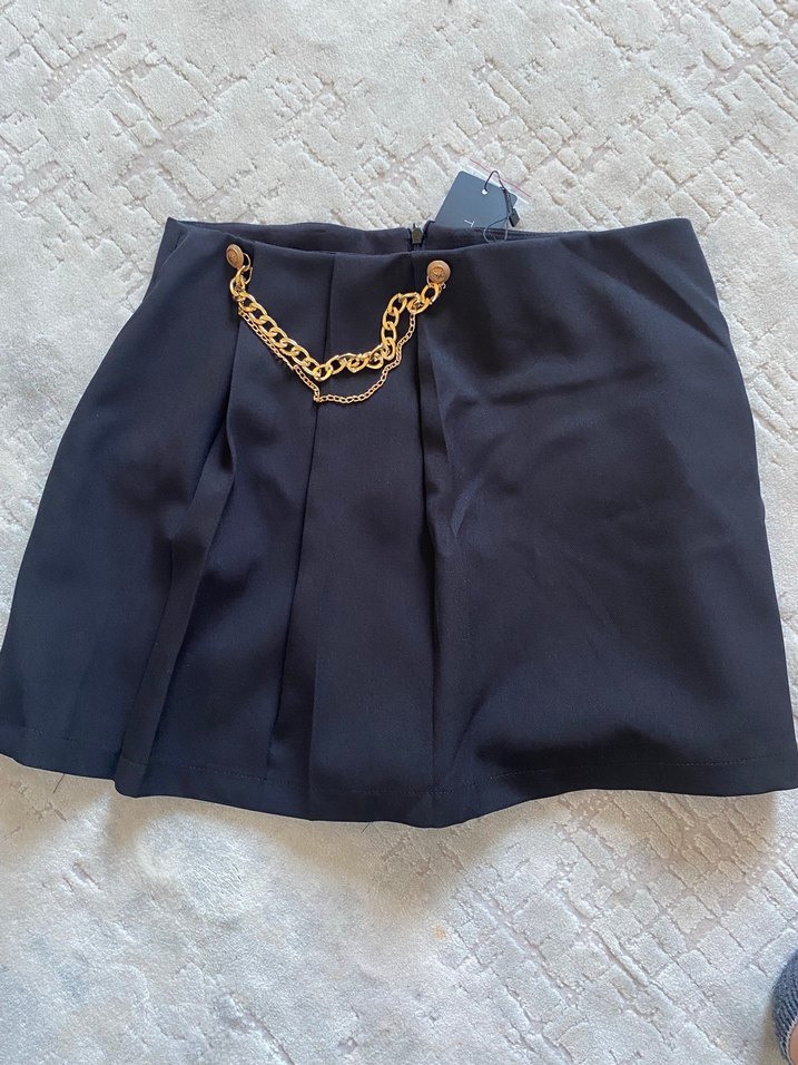 Siyah renkli, ince ve parlak kumaştan üretilmiş, zincir detaylı, bol kesim mini etek. Romantik akşamlar için uygundur.