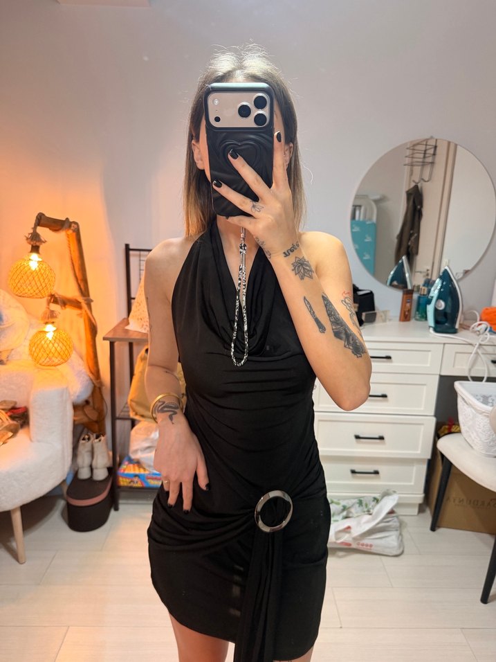 Zincir Detaylı Siyah Mini Halter Boyun Elbise