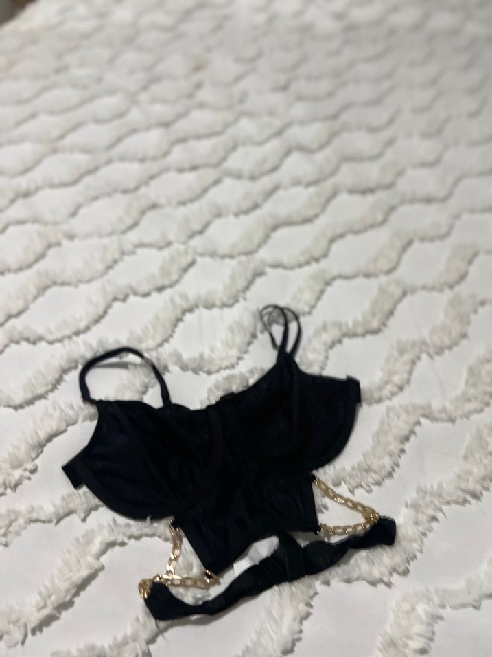 Sentetik kumaştan yapılmış, zincir detaylı ve askılı siyah mini straplez büstiyer. Sokak modası ve günlük kullanım için uygun, vücuda oturan kesim.