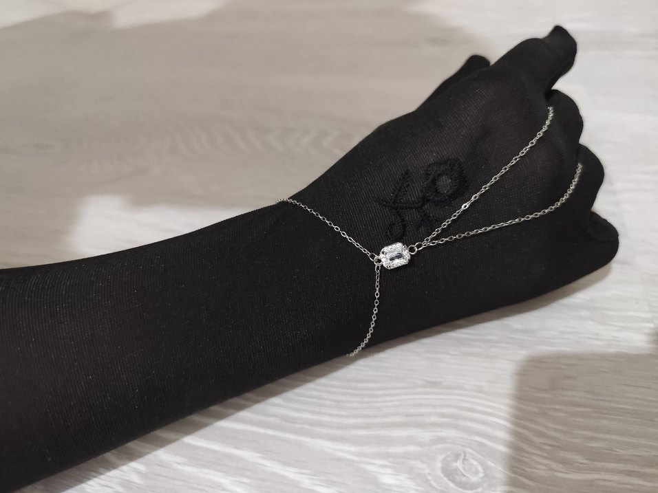 Detaylı zincir tasarıma sahip, parlak siyah minimalist goth tarzında kadın el zinciri, günlük kullanıma uygundur.