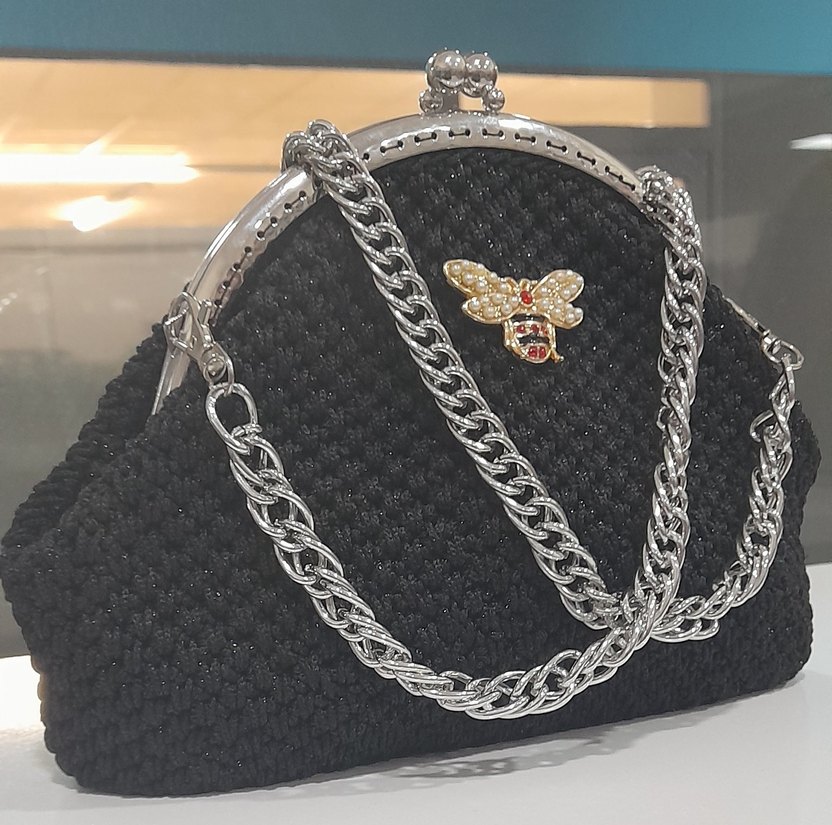 Siyah örme kadın çanta, nakışlı arı detayı ve parlak gümüş zincir askısıyla gotik ve gösterişli bir tarz sunar. istenen renk sipariş alınır