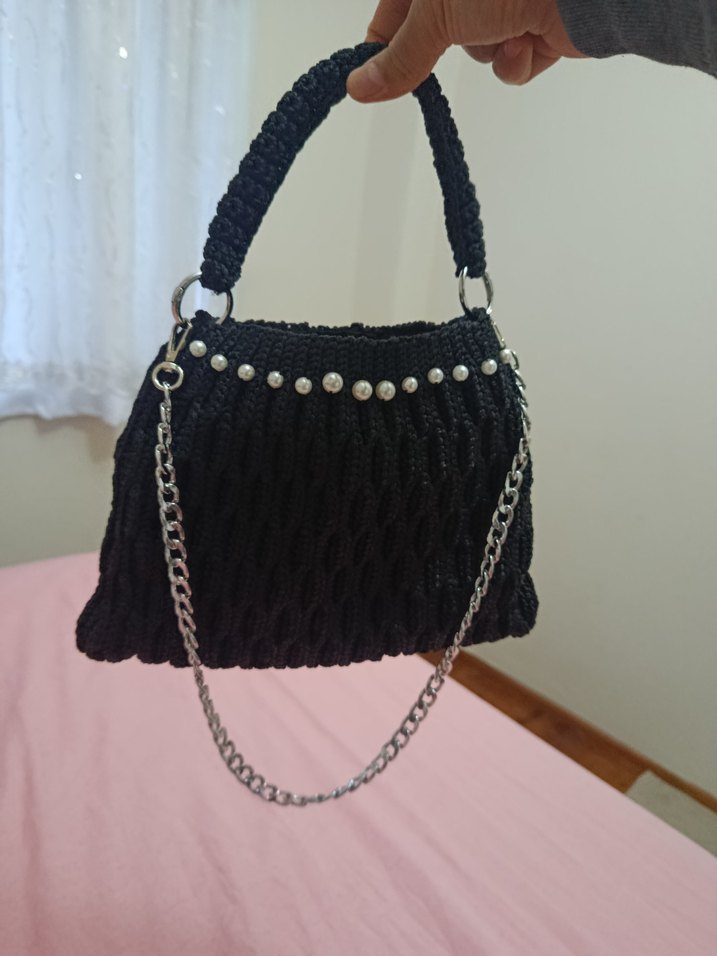 Parlak siyah örgü kumaştan, zincir detaylı ve inci süslemeli kadın çantası. Günlük kullanıma uygun, trend goth tarzını yansıtır.